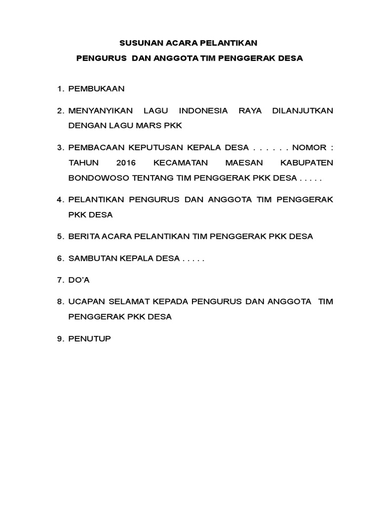 Contoh naskah pelantikan pkk desa. Ikhwono AMd melantik Anggota Tim Penggerak PKK Desa Arenan dengan susunan sebagai berikut. Pramuka Nomor 01 Desa Toyareka Kecamatan Kemangkon Kabupaten Purbalingga. Dalam sambutan Mustaqfirin Camat yang diwakili Sekcam Sumobito berpesan kepada perangkat yang dilantik.