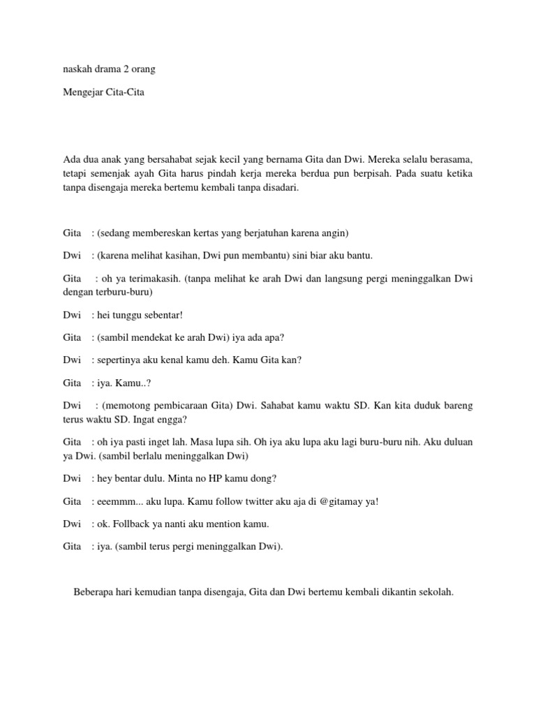 The following english text of this drama is drama in english for 5 people. Contoh naskah drama bahasa inggris 5 orang. Contoh Naskah Drama 2 Orang Mengejar Cita-cita Judul.