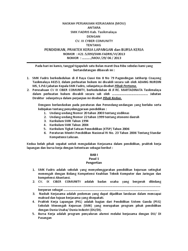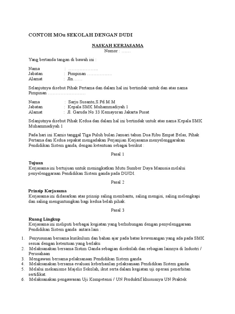Hal-hal lain yang belum tercantum dalam naskah kerja sama ini akan di atur dan di tetapkan kemudian dan merupakan bagian yang tidak terpisahkan dari surat perjanjian kerja sama ini. Contoh MOU Kerjasama Sekolah Menengah kejuruan dengan DUDI. Contoh MOU Memorandum of Understanding - Teks Surat Perjanjian Kerjasama atau Nota Kesepakatan.