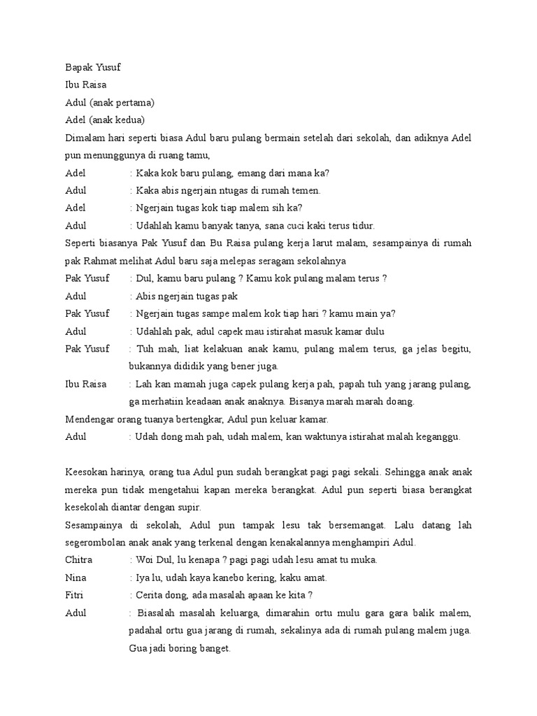 Contoh naskah skenario vct. 48 Mementaskan naskah. Nina Ibunda Nina Terdengar ambience anak-anak kecil sedang berjalan dan bercanda Seorang gadis kecil berkulit putih sedang menali tali sepatunya di atas kursi depan rumah untuk pergi berangkat ke sekolah. Stephen Suarez on Contoh Naskah Drama 8 Orang Tema Bencana Alam PATCHED.