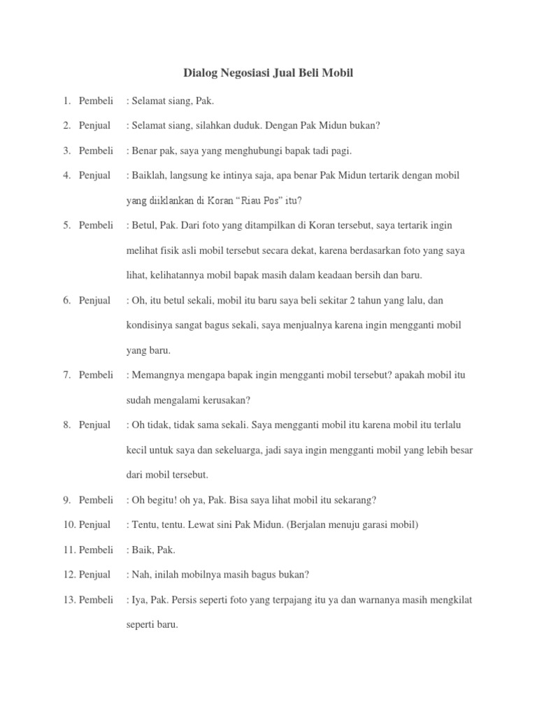 Contoh teks negosiasi jual beli mobil. Contoh Surat Perjanjian Jual Beli Naskah Surat Perjanjian jual beli memiliki sistem terbuka karena dapat dilakukan oleh setiap orang yang telah memenuhi persyaratan untuk melakukan perjanjian. Ditambah lagi tidak banyak sumber contoh surat jual beli tanah yang ada baik di internet maupun yang dapat dibeli.