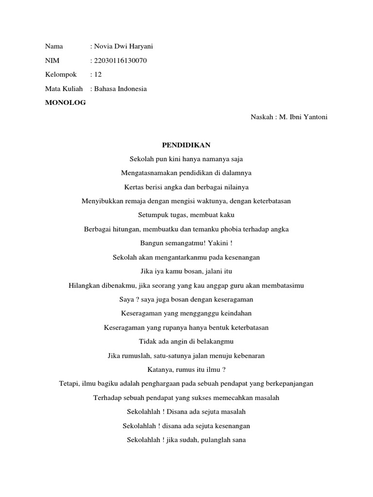 Contoh monolog singkat tentang sekolah pendidikan 9497311 1. Monolog Pendidikan Keajaibandunia Web Teks Drama Monolog Pendidikan K eajaibanduni a Web.