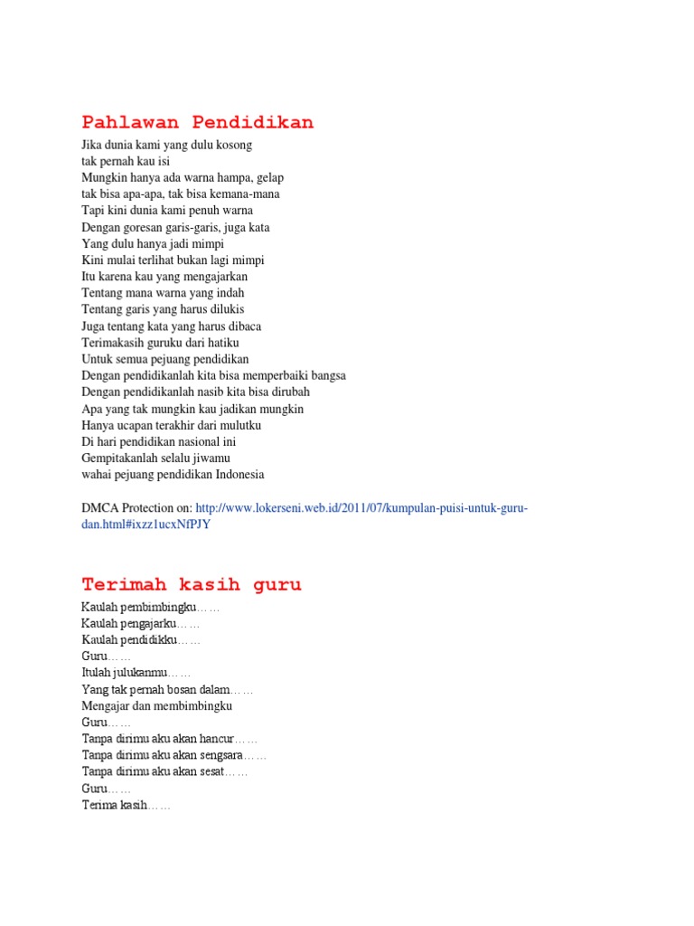 Sehingga menghasilkan karya bagi kepentingan umat manusia. Demikianlah kumpulan puisi pendidikan nasional. Kumpulan Puisi Untuk Hari Guru Nasional Puisi adalah suatu susunan kata-kata yang indah dan bermakna yang terdiri atas beberapa bait serta baris yang tersusun menjadi satu kesatuan.