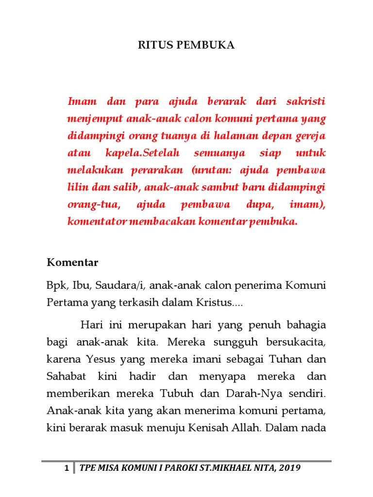 Panduan Misa Komuni Pertama 2017 Buku. Pertama orang tua perlu memotivasi dan mengingatkan anaknya agar dengan tekun mengikuti aneka kegiatan persiapan komuni pertama. 4 Warta Herkulanus Minggu III Mei Sajian Utama Anak-anak calon penerima komuni pertama mengikuti sesi dari hari Sabtu sore sampai Minggu Pagi yang dibimbing oleh seksi Katakese Paroki Santo Herkulanus Depok dan Pastor Kepala Paroki Santo Herkulanus Depok RD Tri Harjono.