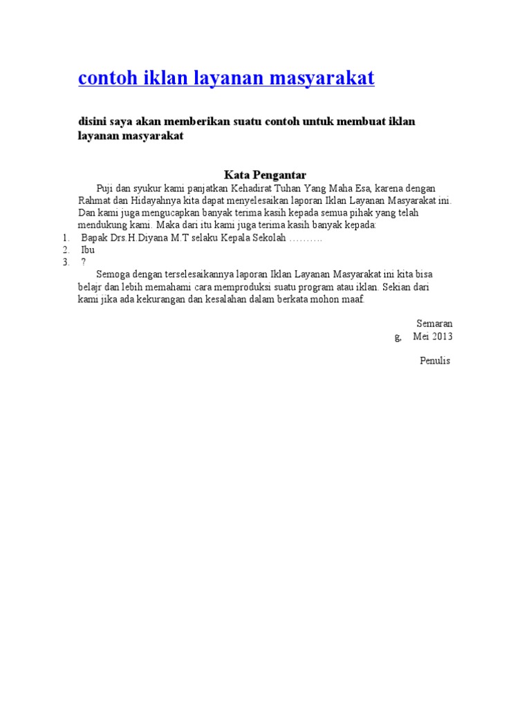Contoh naskah iklan layanan masyarakat tentang sampah. Hal tersebut diakibatkan dari kebiasaan masyarakat yang sering membuang sampah sembarangan di area sungai selokan dan lainnya sehingga menyebabkan air tersumbat. Unduh sebagai DOC PDF TXT atau baca online dari Scribd. 10 Contoh Naskah Iklan Layanan Masyarakat Indonesia - YuKampus Pentingnya Iklan Layanan Masyarakat Pengertian Fungsi dan.