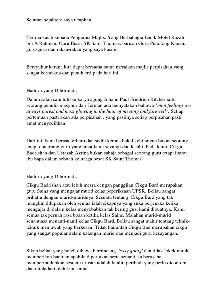 Guru bukan hanya sebatas memberikan pelajaran ilmu melainkan membimbing serta memberikan perhatian dan kasih sayang kepada murid-muridnya. Teks Ucapan Pelajar Majlis Perpisahan Tahun 6.