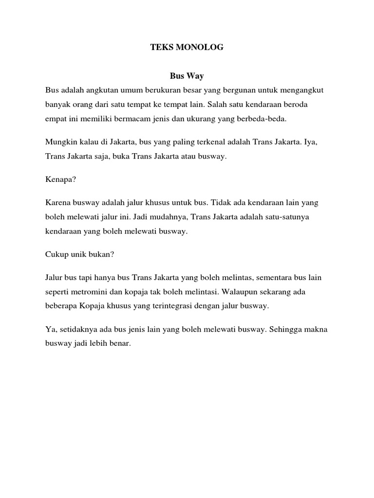 Contoh Teks Monolog Monolog merupakan istilah dalam bidang keilmuan yang diambil dari kata mono yang memiliki arti satu dan log dari kata logi yang memiliki arti ilmu. Secara harfiah monolog merupakan sebuah ilmu terapan yang berkaitan dengan seni peran dimana hanya membutuhkan satu orang saja atau dialog bisu untuk sebuah adegan. Contoh Naskah Drama Monolog 1 Orang Barisan Contoh.