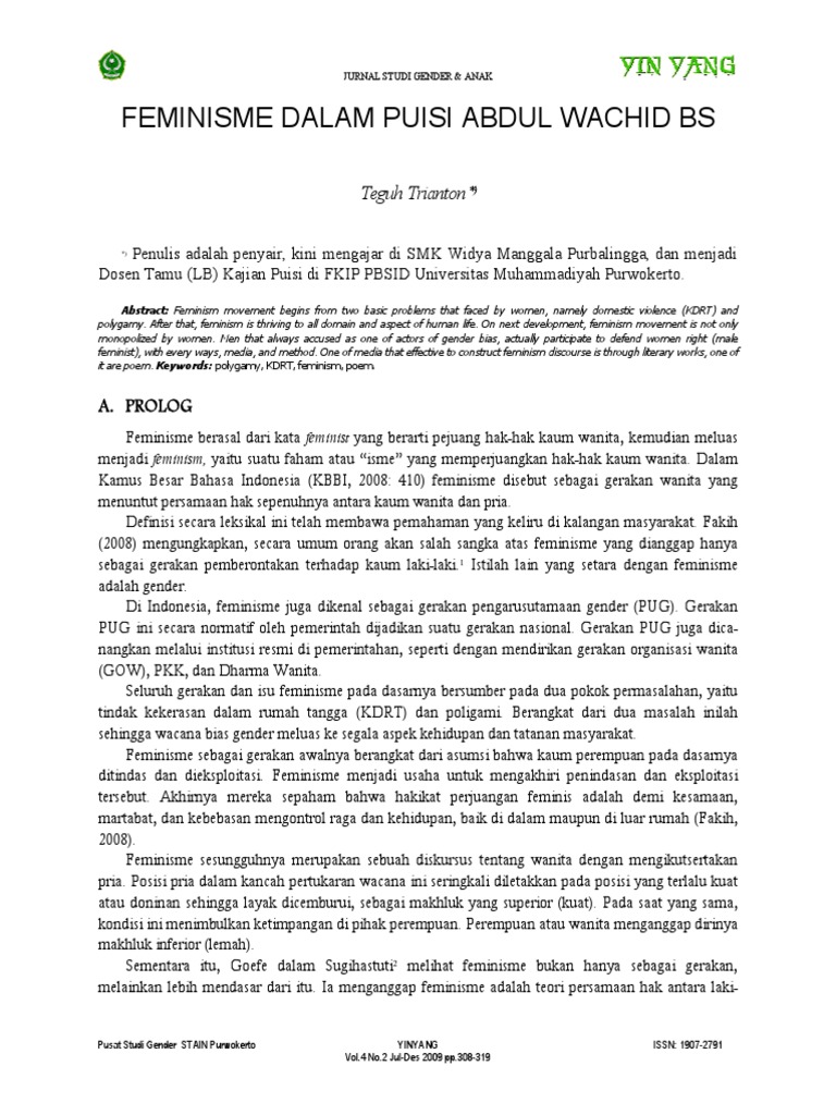Feminisme Dalam Puisi Abdul Wachid Bs. Artikel Terbaru puisi feminis - Feminisme. Feminisme dalam Kumpulan Puisi Surya AManan Walikota Tanjungpinang Studi.