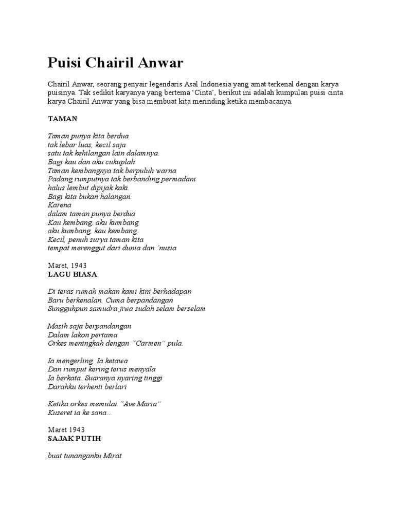 Kumpulan Puisi-puisi Chairil Anwar AKU Kalau sampai waktuku Ku mau tak seorang kan merayu Tidak juga kau Tak perlu sedu sedan itu Aku ini binatang jalang dari kumpulannya terbuang Biar peluru menembus kulitku Aku tetap meradang menerajang Luka dan bisa kubawa berlari Berlari Hingga hilang pedih peri Dan aku akan lebih tidak peduli Aku mahu hidup seribu tahun lagi March 1943 Aku puisi. Bagi pecinta sastra atau pemerhati kesusastraan dan kepenyairan di Indonesia nama Chairil Anwar tentu tidak asing di telinga. Ia diperkirakan telah menulis 96 karya termasuk 70 puisi ia dinobatkan oleh HB Jassin sebagai pelopor 45 sekaligus puisi modern indonesia.
