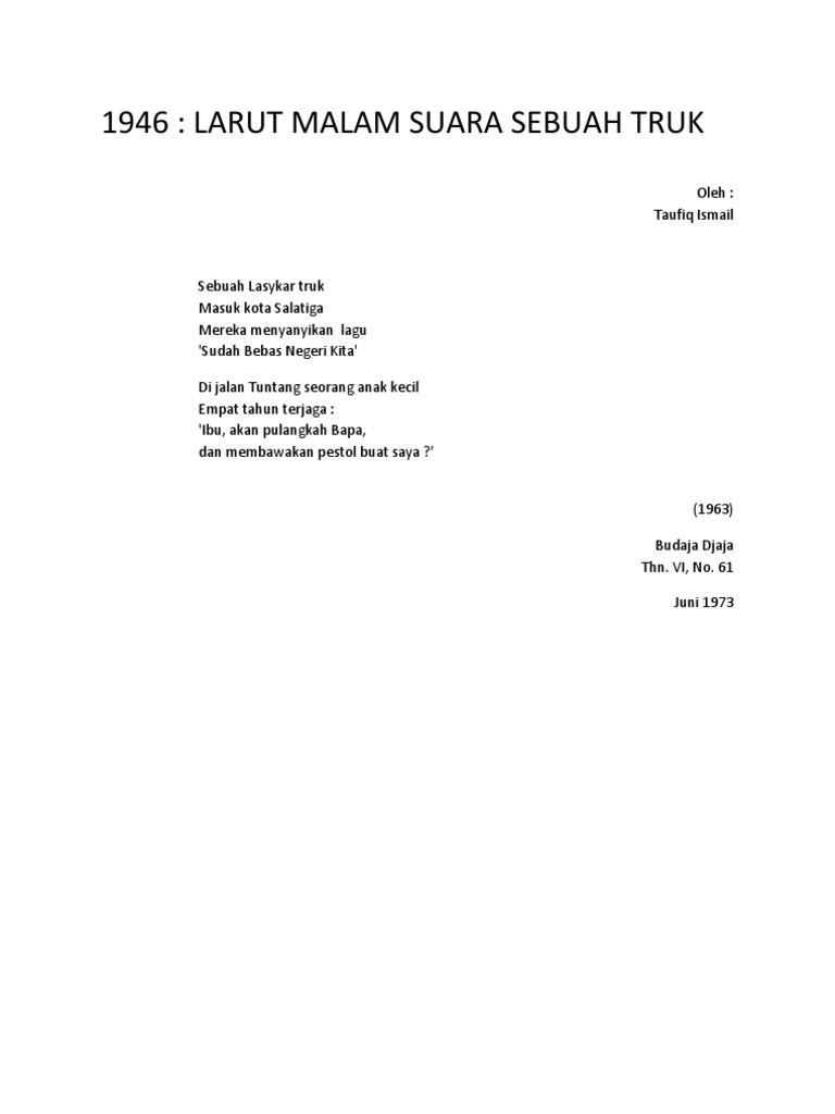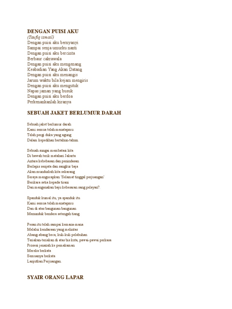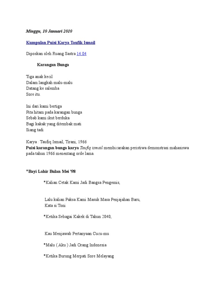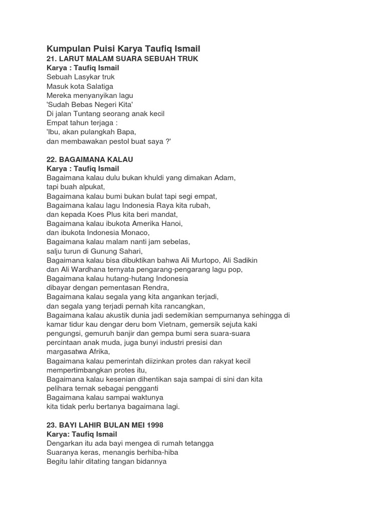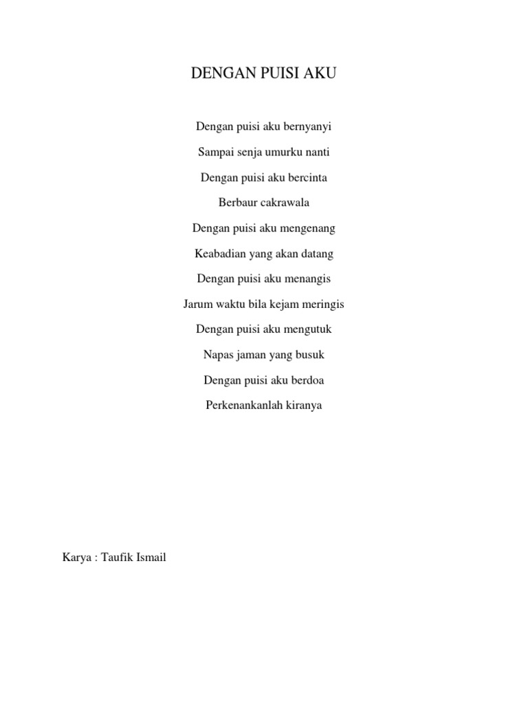 Noer DRUmar Khayam Nasyah Jamin dan masih banyak lagi seniman lainnya. KUMPULAN PUISI KARYA TAUFIK ISMAIL. Dimulai sejak Indonesia merdeka Didominasi jenis cerpen dan kumpulan puisi yang bertema protes terhadap berbagai kebijakan Kumpulan Puisi Hebat Taufik Ismail Bagian Belajar Kreatif Bosan dengan kecenderungan puisi Indonesia yang terlalu serius awal 1970-an menggarap humor Kita menjebakkan diri dalam krangkeng budaya puisi cinta budaya indonesia.