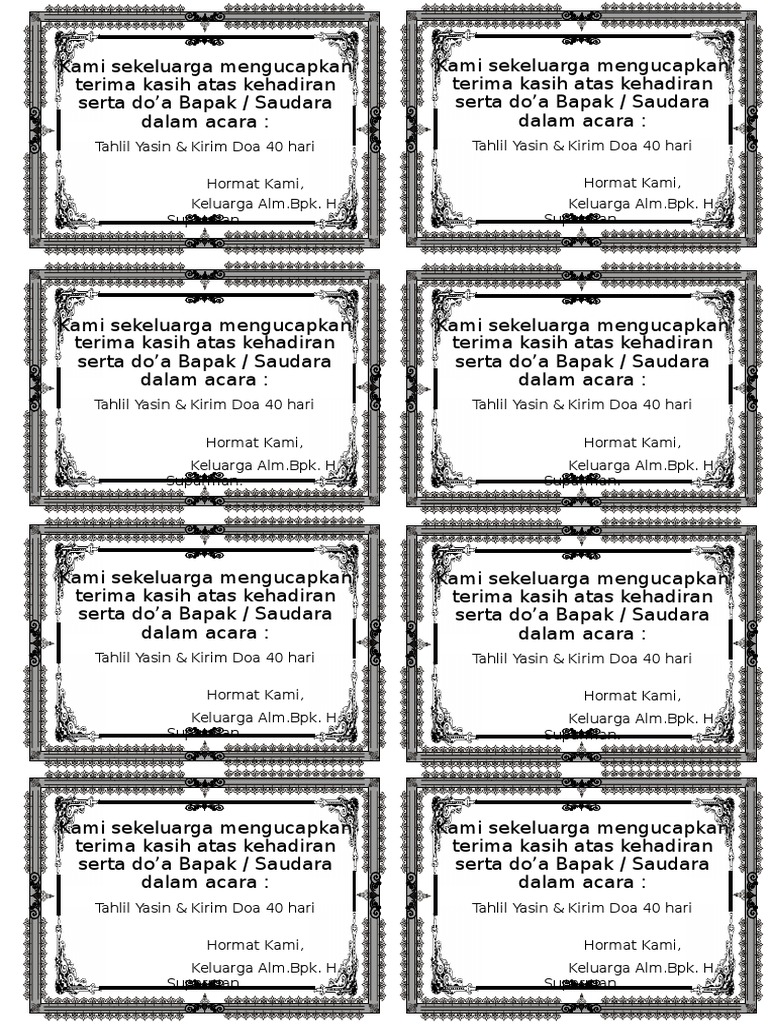 Kartu ucapan Terima kasih bentuk kotak tanpa nama pasangan pengantin Detail produk. Download ucapan di kotak nasi 40 hari word itulah template kartu ucapan 1000 hari orang meninggal doc yang dapat digunakan langsung dan bisa di edit terdapat ukuran mulai dari yang paling kecil sampai yang paling besar tinggal cocokkan saja dengan nasi kotak yang kamu gunakan ada juga desain 1 lembar isi 10 kotak dan satu lembar isi 3 kotak. Pengetan 1000 hari bahasa jawa ini sudah lekat pada masyarakat jawa sebagai adat dalam mengadakan tahlilan.