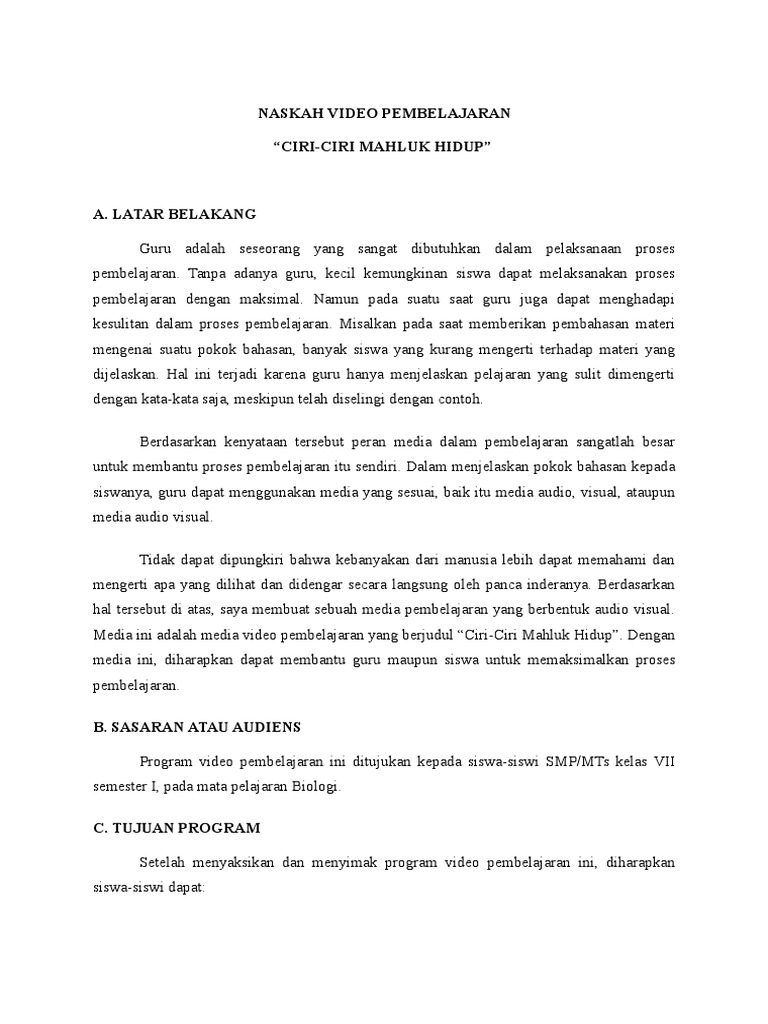 NASKAH VIDEO PEMBELAJARAN CIRI-CIRI MAHLUK HIDUP A. Naskah videotelevisi pembelajaran sebaiknya ditulis dengan memperhatikan metode pembelajaran. Sahabat sebelum memulai mempelajari Modul 8 Pengelolaan Kelas Yang Mengintegrasikan TIK dalam Lingkungan Belajar ini silahkan Sahabat simak video pengantar berikut.