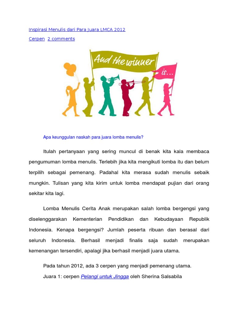 Peserta lomba adalah masyarakat umum tanpa batasan usia. Ii 10 Naskah Terbaik Lomba Menulis Cerita Anak LMCA Tahun 2015 10 Cerpen Pemenang Lomba Menulis Cerita Anak LMCA Tahun 2015 Mencari Ujung Pelangi Kalyana Adzhara Bintang Nurul Hidayati Gita Mawadah Yulianna Shofiyyah Lukman Pandan Raditya Arundhati Satya Khansa Tabina Khairunissa Aflahchintya Azka Ardhana Reyfasha Zahara Suharmoko. Lomba yang diselenggarakan dari tanggal 20 November 2016 sd.