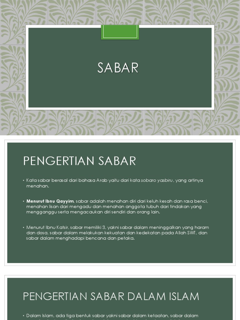 Kata sabar sendiri berasal dari bahasa Arab yaitu dari kata sobaro yasbiru yang artinya menahan. SABAR Kata sabar sendiri berasal dari bahasa Arab yaitu dari kata sobaro yasbiru yang artinya menahan. Sedangkan secara istilah sabar yaitu menahan diri atas segala macam bentuk kesulitan kesedihan atau menahan diri saat menghadapi segala sesuatu yang tidak disukai dan dibenci.