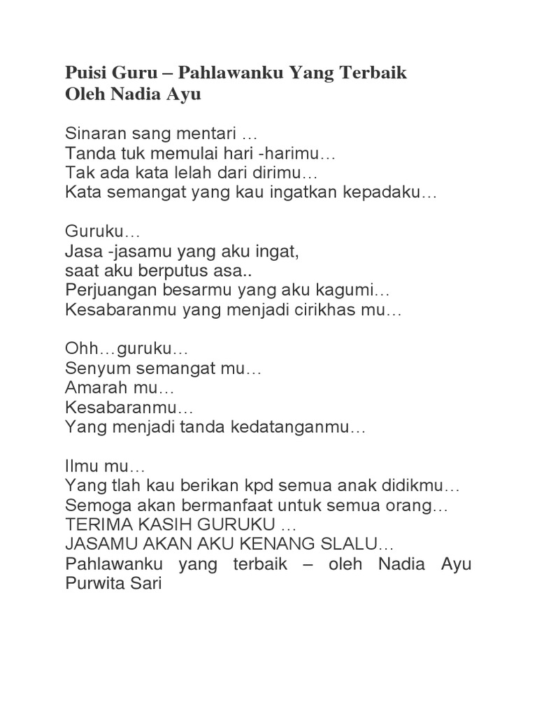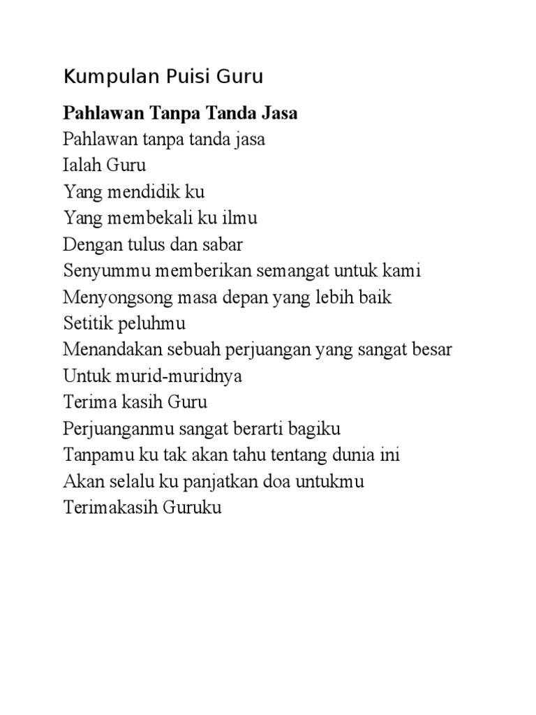 Itu sebuah kata kata bijak yang dari kecil penulis dengar. Jngn bilang sapa2 yachaku kasih tahu nichada monyet bisa baca SMSini skarang buktinyahihimsh gak percaya baca lagi dech. Kumpulan Puisi Untuk Hari Guru Nasional Puisi adalah suatu susunan kata-kata yang indah dan bermakna yang terdiri atas beberapa bait serta baris yang tersusun menjadi satu kesatuan.