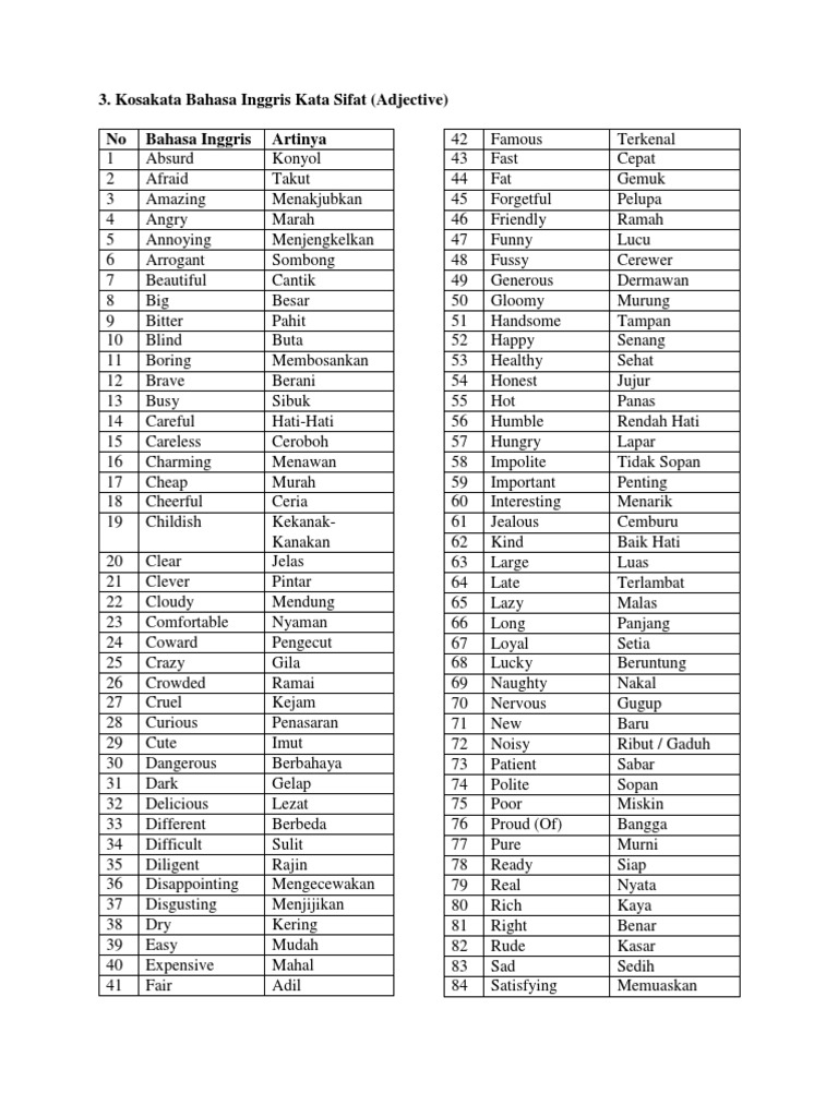 Kumpulan kosakata bisa meningkatkan keterampilan berbahasa baik menulis maupun berbicara. Adjective adalah kata yang digunakan untuk menerangkan noun kata benda atau pronoun kata ganti yang dapat berupa orang person tempat place hewan animal benda atau konsep abstrak thing.