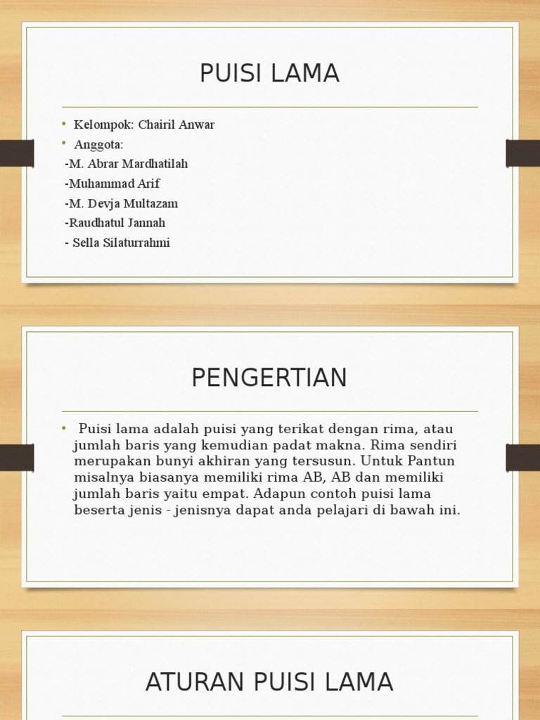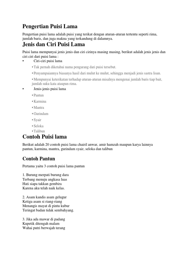 Contoh Puisi Lama Seperti yang telah kita ketahui puisi lama adalah jenis puisi yang masih terikat dengan beragam aturan dan telah muncul sejak zaman dahulu. Saya telah menyajikan 10 teks puisi yang berbeda disertai pengarangnya.