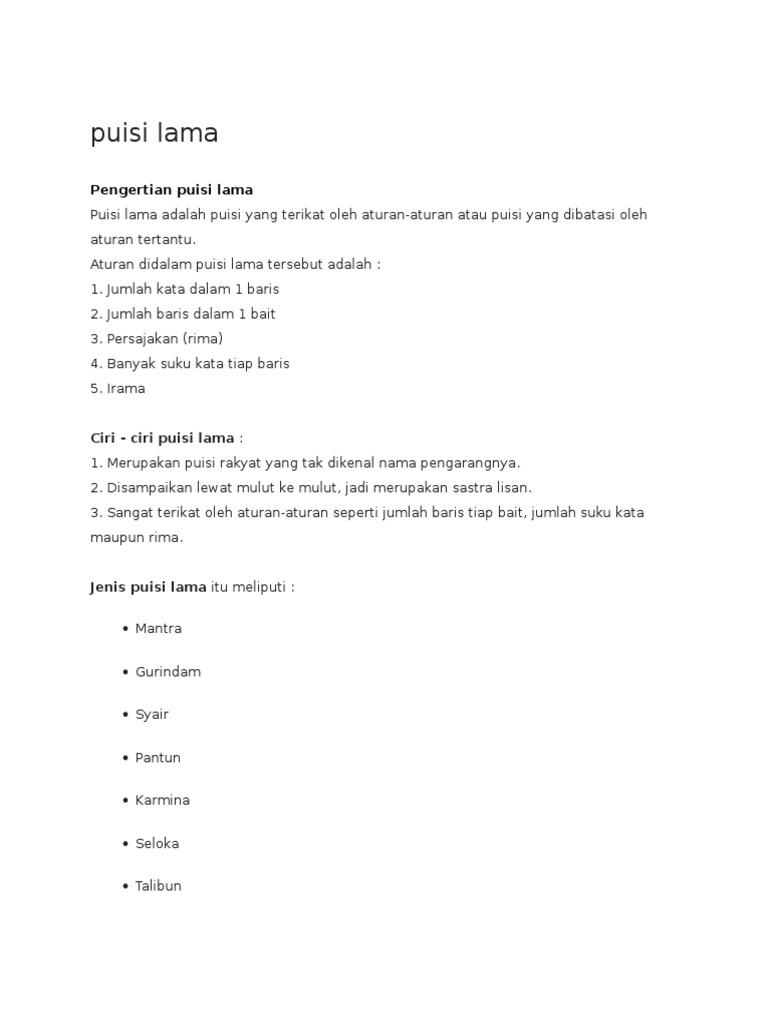 Sangat terikat oleh aturan-aturan seperti jumlah baris tiap bait jumlah suku kata maupun rima. Sebelumnya kita sudah membahas jenis jenis puisi berdasarkan bentuknya isinya dan zamannya. 1001 Kumpulan Puisi lama dan puisi baru yang kami pilih untuk kita.