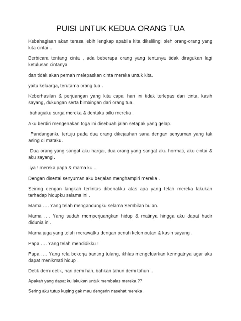 Hingga ku dapat hadir di dunia ini. Contoh Puisi Untuk Kedua Orang Tua - Puisi Untuk orang tua ini merupakan puisi yang menggambarkan seorang malaikat yang tanpa tanda balas saja sedikitpun. Anda bisa simak bacain voting komen atau download sebagai gambar storystatus.