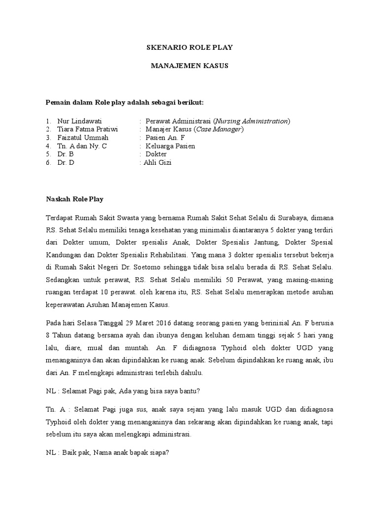Contoh naskah skenario role play. Adapun Tujuan kita melakukan Ronde Keperawatan adalah untuk untuk mengatasi masalah keperawatan klien yang belum teratasi selama dirawat di rumah sakit. Perawat 3 Zulfa E. Kedua Catat lokasi skala nyeri yang sebenarnya itu untuk mengunturupsi tempat dan penyebab nyeri.