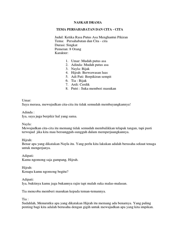 Contoh Naskah Drama Singkat Contoh naskah drama singkat memberikan gambaran tentang bagaimana cara membuat naskah yang baik dan benar. Contoh naskah teater persahabatan persahabatan ialah salah satu ikatan terdalam dalam kehidupan insan yang ditempa melewati rasa saling percaya sokongan tanpa kriteria dan tidak mementingkan diri sendiri. Contoh Naskah Drama Singkat Saat pagi hari disebuah sekolah SMA Sandi berlari menghampiri Bande Rangga dan Faiz.