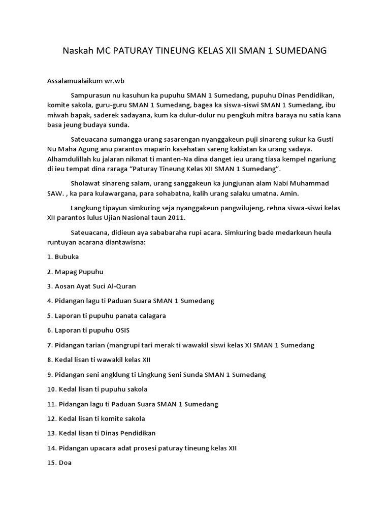 Saacana medar conto naskah panata acara ringkes atawa basa nasional na mah Contoh naskah MC pernikahan singkat bahasa Sunda. Teks naskah mc bahasa sunda pengajian rutinan mudah dan simpel untuk pemula 4 menit jago jadi mc music file has have been uploaded since 4 months ago. Sampurasun nu kasuhun ka pupuhu SMAN 1 Sumedang pupuhu Dinas Pendidikan komite sakola guru-guru SMAN 1 Sumedang bagea ka siswa-siswi SMAN 1 Sumedang ibu miwah bapak saderek sadayana kum ka dulur-dulur nu pengkuh mitra baraya nu satia kana basa jeung budaya sunda.