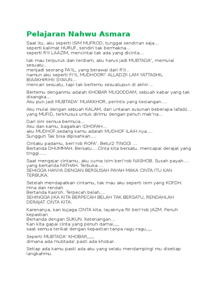 Kata kata nahwu tentang kehidupan kata kata nahwu asmara kata kata cinta mubtada dan khobar kata kata rindu dalam ilmu nahwu kata kata cinta menurut jurumiyah kata cinta kitab jurumiyah gombalan santri nahwu kata kata mutiara dari kitab jurumiah. Pelajaran Nahwu Asmara. Tak mau terpuruk dan terdiam aku harus jadi MUBTADA memulai sesuatu.