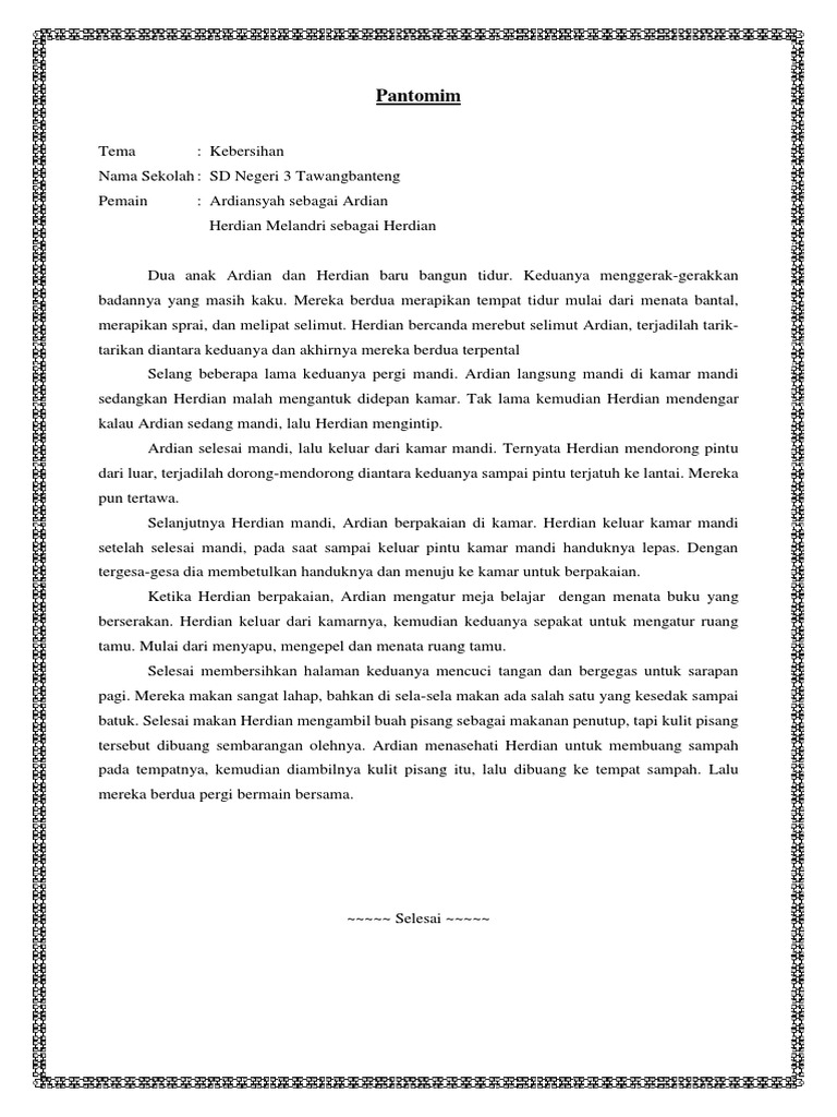 Dan yang tak kalah penting juga pemilihan anak serta durasi latihan. Kumpulan Contoh Naskah Pantomim Tema Cinta Kasih FLS2N SD 2017docx Download Naskah Pantomim Tema Cinta Kasih Teman DEMI SAHABAT Pada suatu pagi yang cerah jam berdering dengan kencangnya sehingga membangunkan Ashraf dari. Naskah pantomim tema kebersihan terbaru 2016.