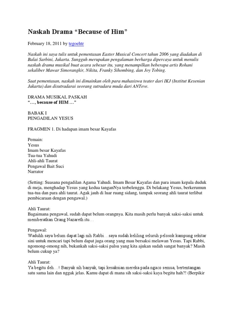 Dalam teks dialog drama terdapat beberapa bagian penting mulai ide karakter pesan yang ingin ditonjolkan dan. Saat mengetahui kata drama tentu membuat Anda teringat akan suatu pertunjukan di atas panggung dengan para pemain yang berkostum unik serta dandanan yang nyentrik tergantung judul atau tema yang diambil pada naskahnya. Dan fragmen ini ditulis terinspirasi atas kasih yang diajarkan Tuhan Yesus pada kita semua.