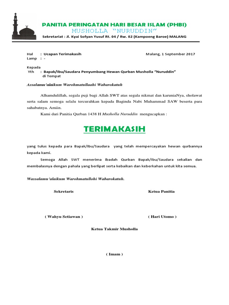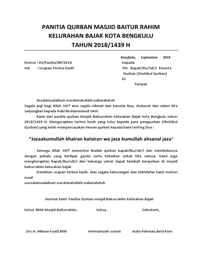 If there is a picture that violates the rules or you want to give criticism and suggestions about Contoh Surat Ucapan. Kami selaku Panitia Idul Adha 1437 H Annajah Taman Melati Indah mengucapkan terima kasih yang sebesar-besarnya kepada para pekurban yang telah. Ucapan Terima Kasih Panitia Qurban 1432 H Pesantren Islam Al-Irsyad 17 November 2011 Berita Pesantren Alhamdulillah puji dan syukur kami panjatkan kehadirat Allah Subhanahu wa Taala Maha Pemberi Nikmat yang telah memberikan karuniaNya sehingga Pesantren Islam Al-Irsyad melalui Panitia Qurban 1432 H dimudahkan untuk menjalankan berbagai amaliah yang kami.