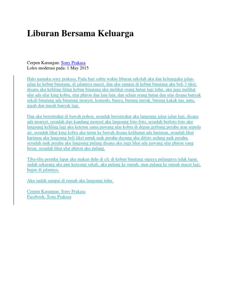 Liburan terbaik dan termurah adalah di rumah berkumpul bercanda ria bersama keluarga. Sebuah cerpen singkat yang bisa menjadi contoh sebuah cerpen liburan 3 lembar dalam word dan tidak sampai 1000 kata. Apapun keadaannya di mana pun tempatnya keluarga adalah prioritas utama hehe.
