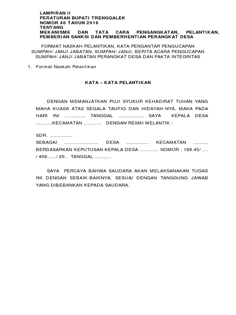 Contoh naskah pelantikan perangkat desa. Dengan mengucapkan syukur alhamdulillah marilah kita panjatkan puji syukur kehadirat Allah SWT yang telah melimpahkan rahmat dan karunia-Nya sehingga kita bisa berkumpul dalam keadaan sehat dan dapat menghadiri. Tes Soal Ujian Perangkat Desa Kepala Desa Bahasa Indonesia - sesi 1. Download Contoh Naskah Pidato Sambutan PGRI Cabang.