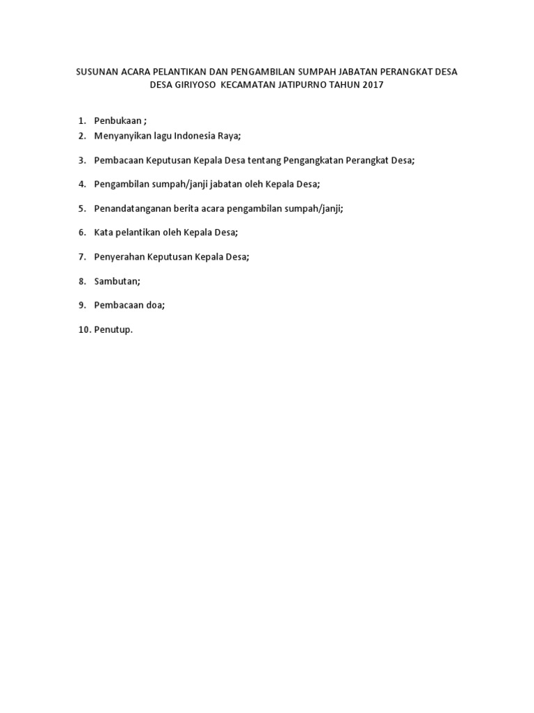 Susunan Acara Pelantikan Dan Pengambilan Sumpah Jabatan Perangkat Desa