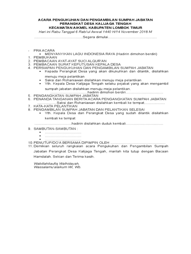 Ini ada beberapa contoh naskah pembawa acarakhususnya pelantikansemoga bermanfaat UPACARA PENGAMBILAN SUMPAH DAN PELANTIKAN KEPALA DESA GIRICAHYOKECAMATAN PURWOSARI KABUPATEN GUNUNGKIDUL DIMULAI HADIRIN DIMOHON BERDIRI. Contoh berkas pelantikan panitia inti pilkades Slideshare uses cookies to improve functionality and performance and to provide you with relevant advertising. Sekaligus pembacaan naskah pelantikan oleh Kepala Desa.