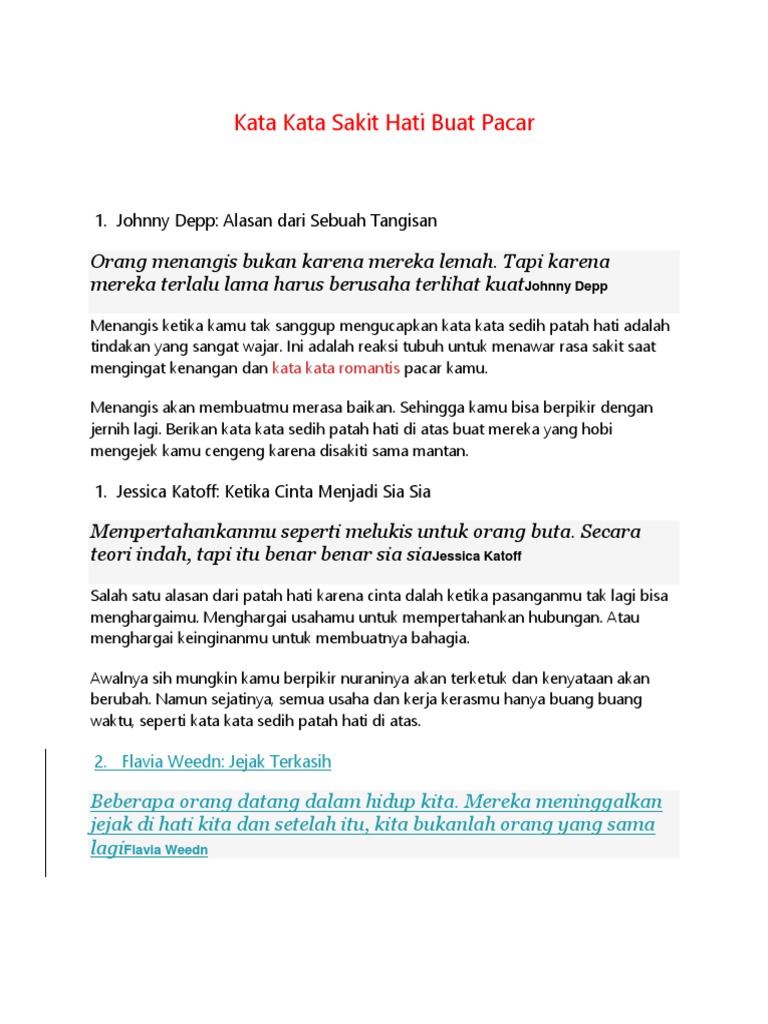 Kata sakit hati buat pacar. Kata-Kata Bijak Mutiara Terbaik untuk Menyemangati Diri Sendiri. Tapi namanya manusia bisa saja memiliki sifat buruk berbuat salah atau berubah menyebalkan. Kata Kata Sakit Hati pada Pasangan Pacar Kekasih Suami Istri Jangan pernah menghitung berapa kali kau sakit hati tapi hitunglah berapa kali kau membuat orang lain sakit hati karenamu.